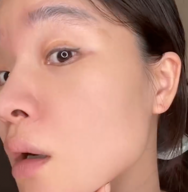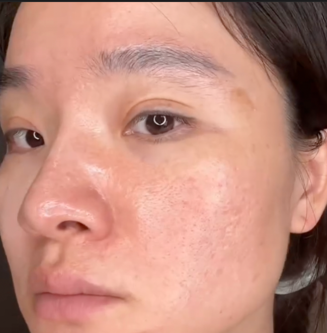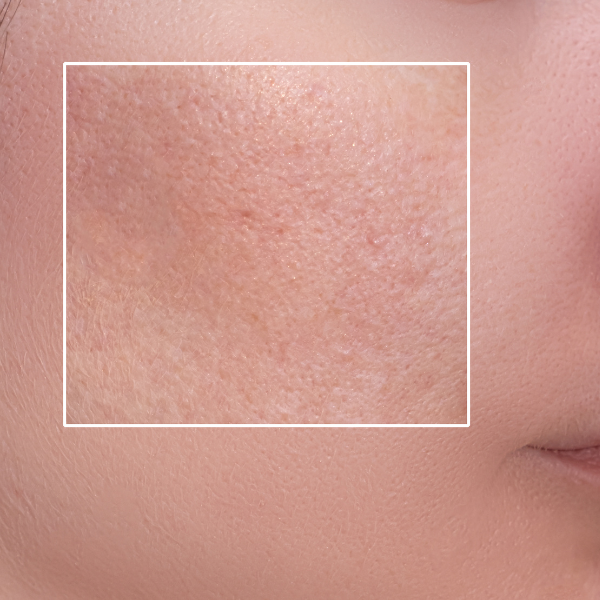 Avant l’application, la peau présente des pores apparents, une texture irrégulière et un manque d’uniformité au niveau du grain. Les imperfections et petites zones de brillance sont visibles, donnant un aspect moins lisse et moins homogène au teint..
